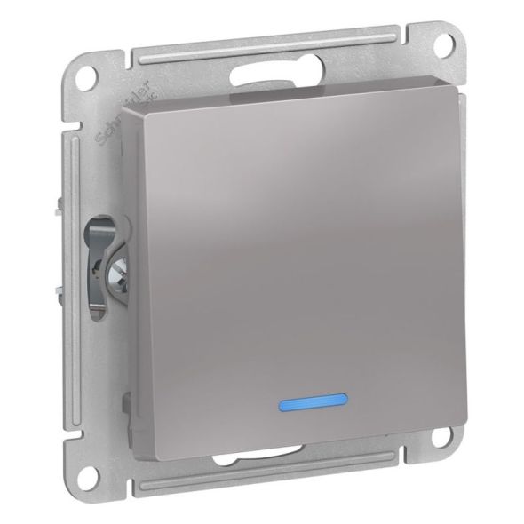 Механизм выключателя 1-клавишного с подсветкой Systeme Electric (ранее Schneider Electric) серии AtlasDesign в цвете алюминий подходит для сетей 250 В, на ток 10 А.- Благодаря светодиодной подсветке синего цвета изделие легко найти в темноте.- Усиленные прямые монтажные лапки для лучшей фиксации механизма в монтажной коробке.- Лицевые детали из качественного ABS-пластика, устойчивого к царапинам и УФ-излучению.